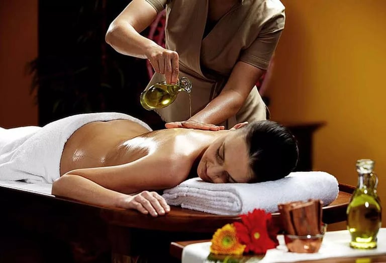 Warm herbal oil massage nourishing skin, relaxing muscles, and detoxifying body.