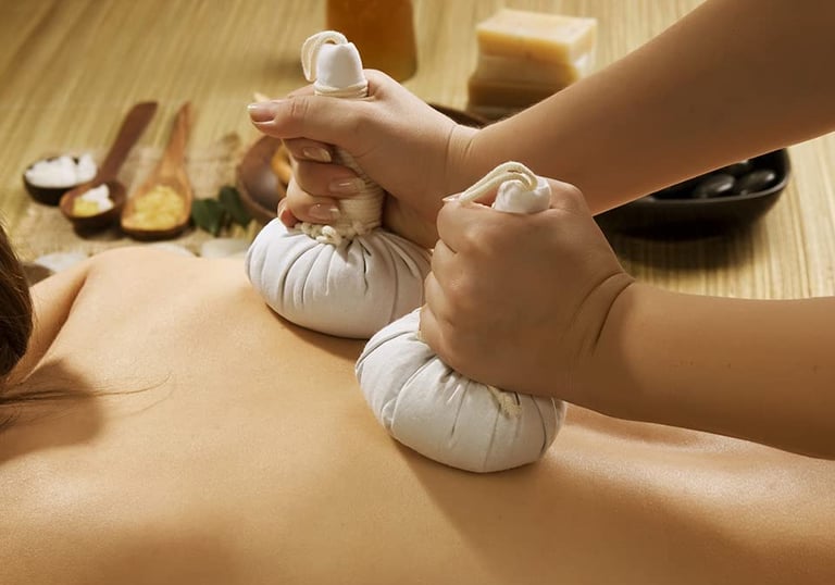 Heated herbal pouches applied to relieve pain, stiffness, and muscle tension.